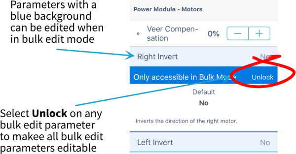 In bulk edit, all parameters are editable but none are written to the wheelchair immediately. They are written to the wheelchair when the Write function is selected.